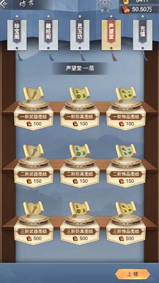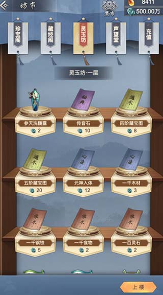 坊市被分为珍宝阁、藏经阁、灵玉坊、声望堂、黑市、充值等