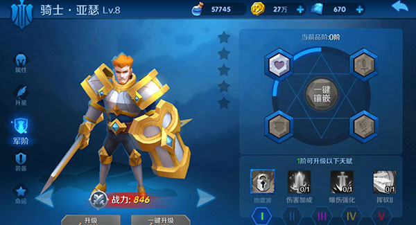 5、军阶消耗符石,军阶突破后开启天赋技能,消耗精英副本掉落的材料学习技能。