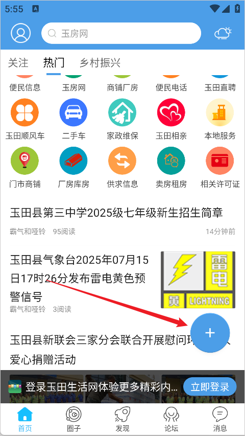 1、打开玉田生活网App,在首页中点击下方+,如图所示: