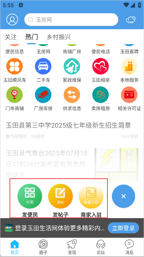2、在这里你可以选择发便民或者发帖子,如图所示: