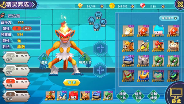 首先是火属性的烈焰猴,克制水属性的敌人堪称完美。利用自身的技能“利爪”与“火花”可以对水属性的小精灵造成致命一击,还有一定概率会直接的触发特种攻击。烈焰猴适合直接安排在阵容的第一位进行战斗,依靠其进攻端的优势,三个回合就可以解决掉敌人三名宠物。这也就为后续的胜利打好了基础。