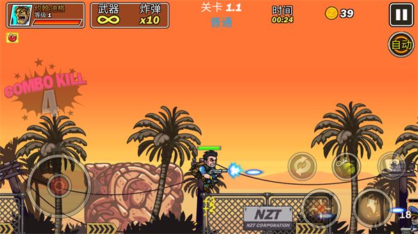 1、玩家操控特种兵在2D横版战场中移动,通过虚拟摇杆控制前后左右移动,点击射击按钮消灭迎面而来的敌人,过程中需灵活走位躲避敌方攻击。