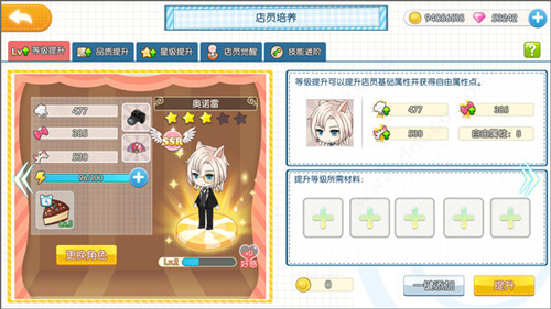 等级提升:提升等级可以用经验书也可以吃其他店员来升级(好残酷的喵星人世界)……可以手动挑选材料也可以交给系统君一键添加。这里要说一下,只有珍贵度在R以下的路人店员也就是N级店员会被一键添加,所以店长们不用担心自己心水的小哥哥会遭遇被吃掉的命运了。