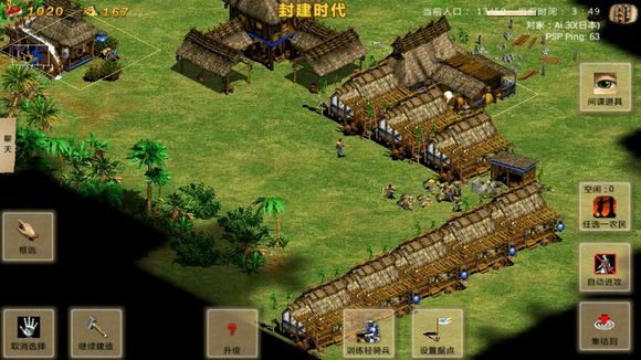 敌人民兵前来骚扰,这时用农民在从矿场到城镇中心一线用住房地基围住,并派一名采果农民躲进城镇中心(选中一名采果农民,点下方的“避难”)就可以轻松射死敌人民兵。待敌人死后,点击右侧的“出营”农民便会重新出来工作。