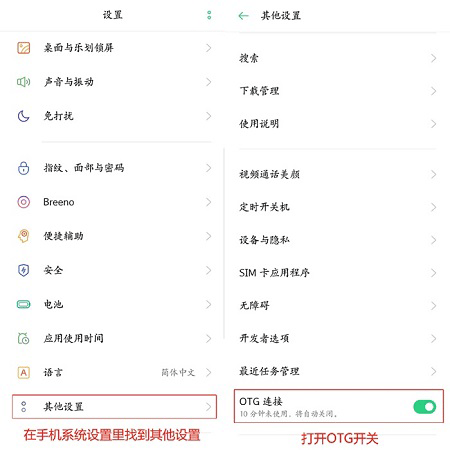 打开步骤:在手机系统设置—其他设置—打开OTG开关