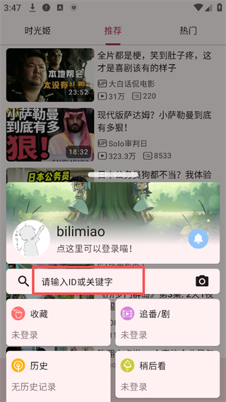 打开bilimiao哔哩喵App后可通过输入ID或关键字进行全站搜索。