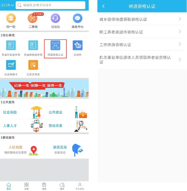 待遇资格认证,为参保人提供城乡居保待遇领取资格认证、职工养老离退休资格认证、工伤待遇资格认证、机关事业单位退休人员领取养老金资格认证等服务。操作步骤如下: