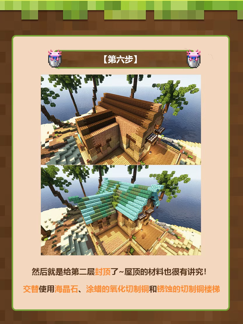 6、然后就是给第二层封顶了~屋顶的材料也很有讲究!交替使用海晶石、涂蜡的氧化切制铜和锈蚀的切制铜楼梯