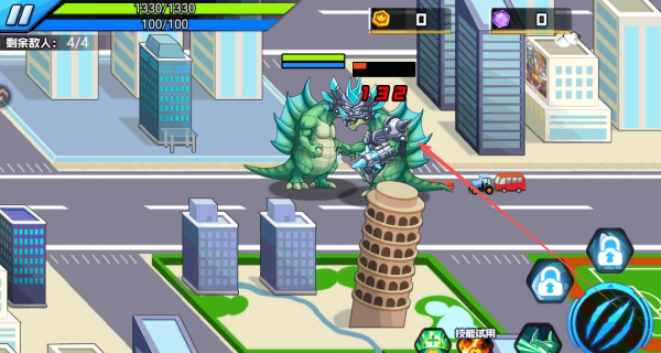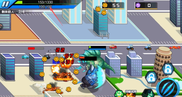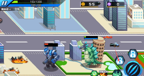 关卡终极挑战是一款横版动作战斗游戏,操控强大的怪兽,在都市中展开激烈战斗。大量的关卡,难度由低到高不断提升,非常刺激,每一关的敌人设计都超有创意,战斗节奏快到心跳加速。融合策略操作,合理利用自己的技能释放,规划技能释放的顺序,避免真空期,例如解锁攻击范围广的技能,面对群敌时可快速清场,减少自身受击概率,节省血量资源,还能利用城市场景的可破坏特性,摧毁建筑作为临时掩体,阻挡敌人攻击或创造输出空间。