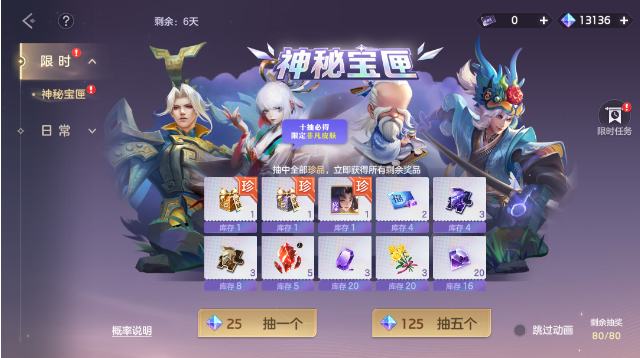 使用宝匣探秘券/龙晶进行抽奖,珍品奖励包括传说皮肤自选箱、宝匣史诗皮肤自选箱、美杜莎·游云观日,高级奖励包括赤焰灵玉、皮肤碎片、英雄碎片、钻石祈福卡等你来抽!最多10抽必得美杜莎·游云观日,抽完所有珍品奖励可直接获取剩余所有奖励。