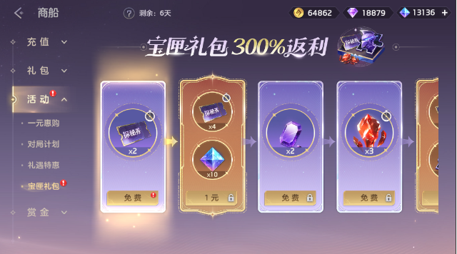 按顺序逐步解锁礼包,宝匣探秘券、龙晶、赤焰灵玉、皮肤碎片等多种奖励,累计可享300%返利。