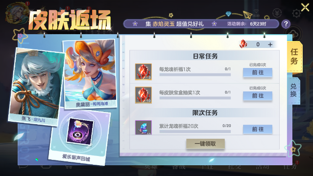 通过任务、神秘宝匣、宝匣礼包获取赤焰灵玉,即可兑换张飞·定九川、奥黛丽·鸭鸭海滩、爱乐留声回城、流音织声播报、青花写意头像框、英雄随机箱、奇奇怪怪·奇奇头像、直接起飞表情等好礼。