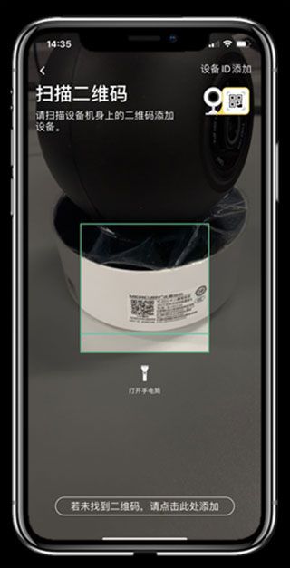 2、登录APP后,摄像机在出厂状态下上电后红绿灯交替闪烁,在APP上点击 设备 主界面右上角的“+”,扫描无线网络摄像机机身上的二维码。