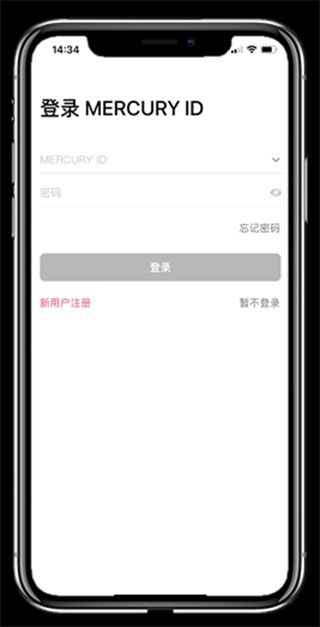 1、下载安装水星安防app,打开MERCURY安防APP,输入MERCURY ID的账号和密码,点击 登录。如果没有MERCURY ID,请点击 新用户注册,按照提示注册MERCURY ID。