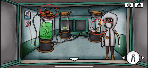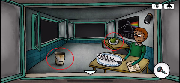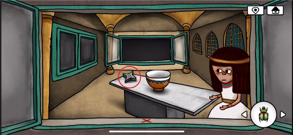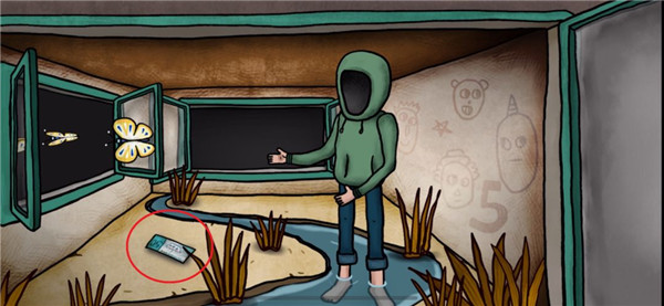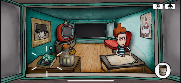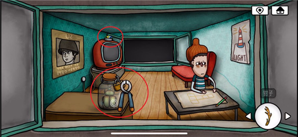 9、再次来到涂鸦小男孩的房间,用钳子打开玻璃罐,得到蜣螂,将天线按照到电视机上,电视内容提示挖出太阳符石的位置