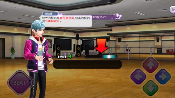 传统模式中,进度条被分为两个区域,左边的一个是“音符显示区”,右边的是“节奏判定区”。玩家需要根据音符显示区中提示的“上下左右”音符方向,点击屏幕右下方相对应的按钮,完成指令。如果玩家输入的音符方向错误的话,则需要重新输入所有的音符,方能继续游戏。