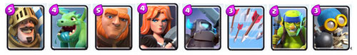 卡组特点:均衡型卡组,圣水消耗低,下兵节奏快,阵容转换时间短;攻守能力均衡,但都不突出;对时机把握、操作水平要求较低;较惧怕对方王子偷家之类的战术。