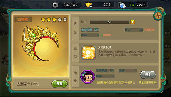 金刚轮为小金刚专属法宝,可以提神自身属性外还有特殊技能友方前排免疫伤害且增加暴击