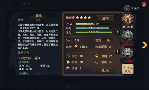 3)点击武将卡牌可查看该武将卡详情,并对武将进行进阶、属性点分配、技能强化等操作。游戏中武将谋士的属性种类非常丰富,其中阵型、攻击距离、兵种是不可变更的基本属性,攻击、防御、谋略、速度、攻城等属性可以通过加点来升级,技能可以通过消耗技巧值来学习和升级。