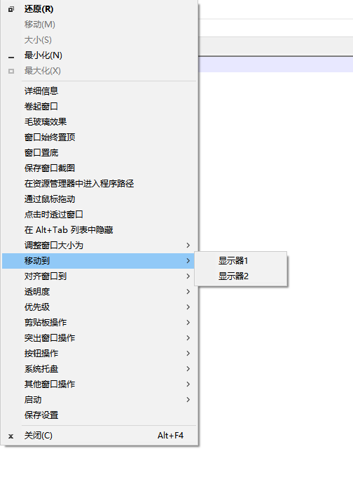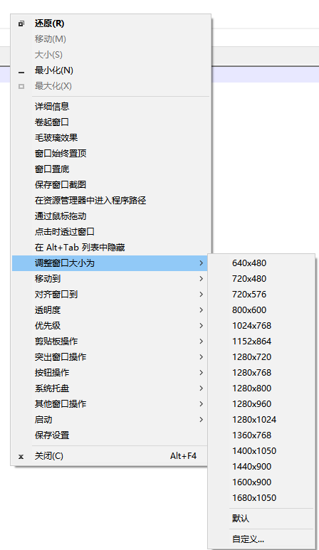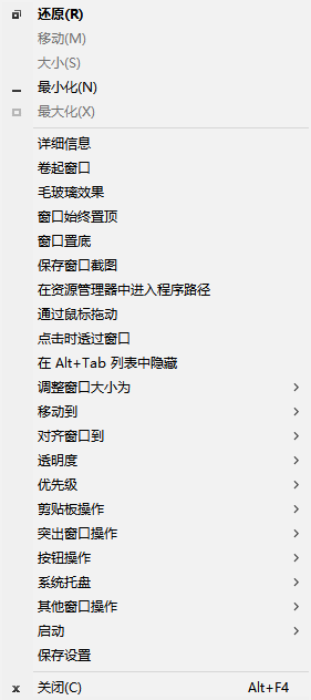 毛玻璃效果:将 “毛玻璃效果” 模糊添加到当前窗口。(仅 Windows Vista 及更高版本支持。主要用于控制台窗口。)窗口置顶. 当前窗口位于所有其他窗口之上。移至最底层. 将当前窗口发送到底部。保存窗口截图. 将当前窗口的屏幕截图保存到文件中。在资源管理器中打开文件. 在文件资源管理器中打开进程文件。通过鼠标拖动. 通过鼠标拖动当前窗口。调整窗口大小. 更改当前窗口的大小。