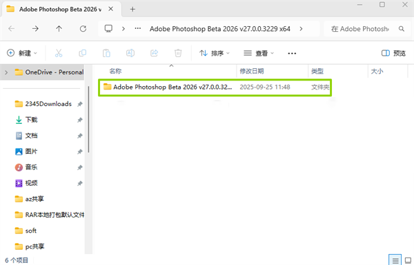 1、在本站下载即可获得Photoshop 2026资源,解压后如图所示,进入“Adobe Photoshop Beta 2026 v27.0.0.3229 x64”文件夹;