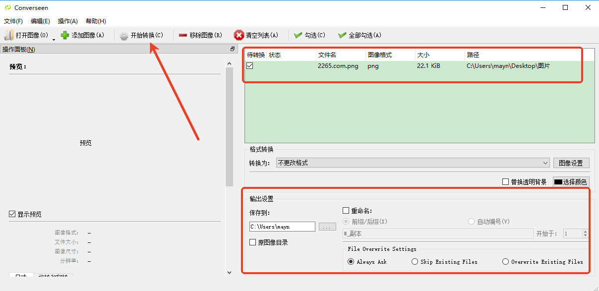 进入主页后,把要需要修改的图片拖进去,然后设置好,点击开始转换即可;