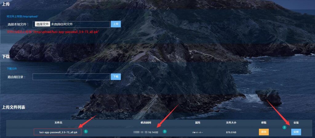 第三步:此时,页面底部的 “上传文件列表”会出现 “ luci-app-passwall_3.9-73_all.ipk ”—“安装”
