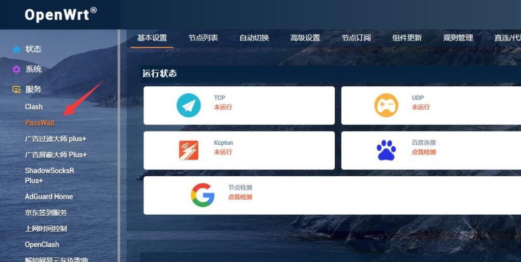 第四步: 安装完成,查看 passwall 插件是否安装成功, “服务”下是否有Passwall 插件。