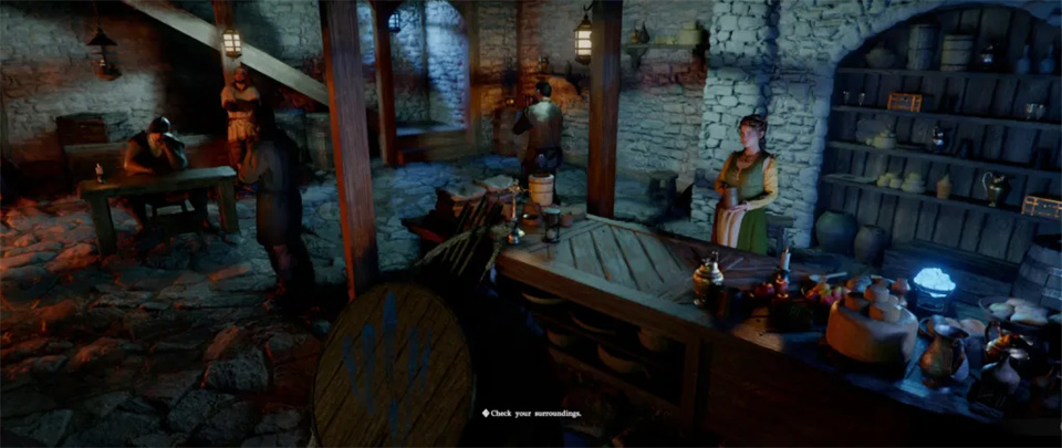 酒馆位于你当前位置的南边,所以你可以前往那里。你会通过门上的招牌认出酒馆入口。