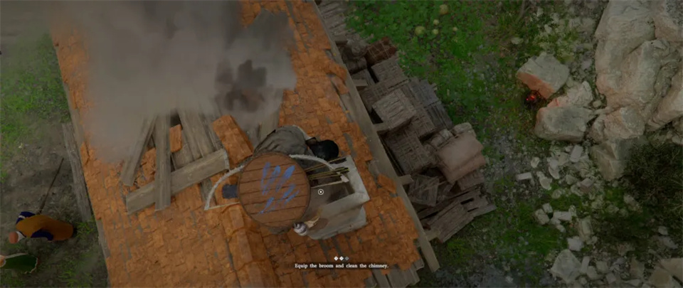 你会拿到扫帚道具,然后爬上屋顶,到达烟囱顶端。用扫帚与烟囱互动;这会促使克利夫清理它。