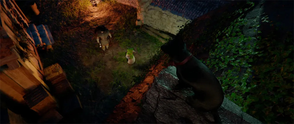 你可以爬上屋顶,把猫捡起来,还给男孩。男孩离开时,会丢下一个奇怪的绿色吊坠;一定要去买。