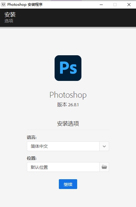 3、打开安装程序后,首先选择安装位置【如果更改了默认位置,则需要记住,后续的激活步骤需要用到】,然后点击继续;