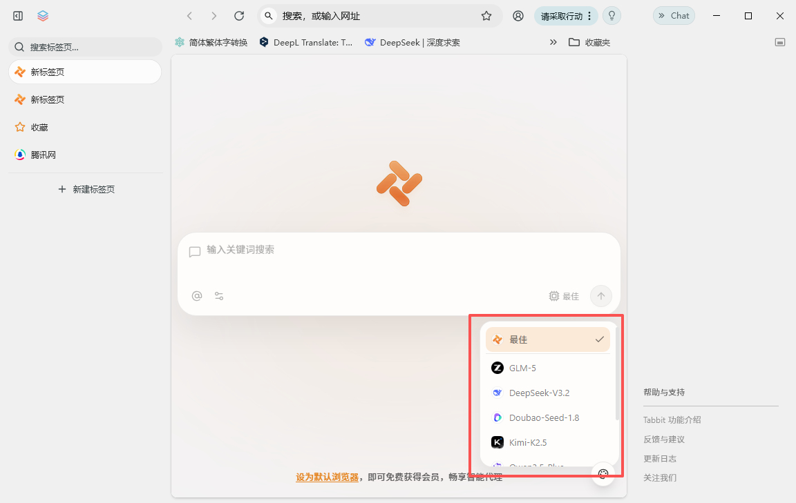 其次,你可以选用不同的开源模型。目前,Tabbit 支持 DeepSeek、Kimi、Qwen、GLM、Minimax。你也可以选择「最佳」让 AI 根据任务自动分配相应模型。