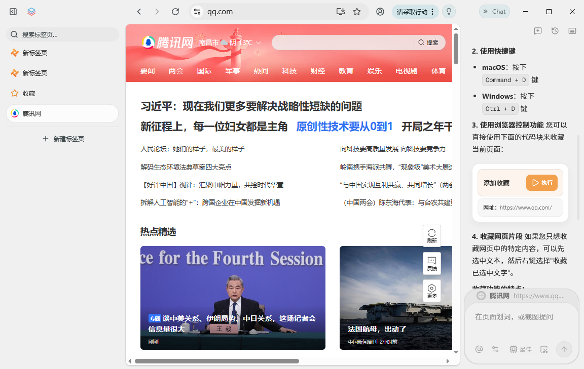 不仅如此,一些基础浏览器设置也不再需要用户手动完成,而是可以自动交给 AI 处理。比如说收藏网页,在给出收藏网页指令后,AI 首先会阅读官方的指令执行手册,然后拆解任务步骤执行,最后,Tabbit 会给出一个执行代码框。用户点击之后,浏览器就会自动化执行,最后收藏该页面。