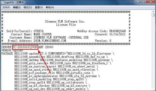 3、接着我们打开CRACK文件夹,然后把里面的ugs4.lic文件放到桌面,用记事本打开ugs4.lic文件,然后把里面的名称改为自己计算机的全称。(PS:右键单击计算机—>属性就可以知道自己的计算机全称,更改设置就可以复制计算机全称)