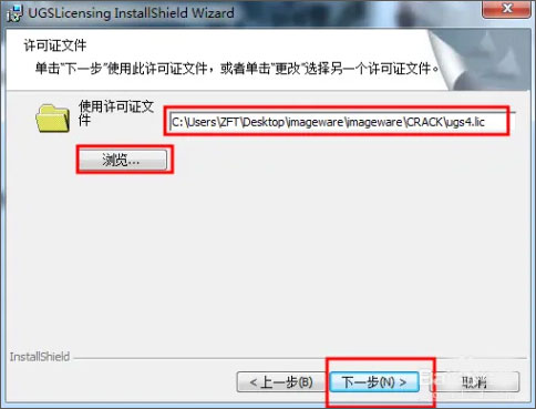 5、单击浏览选择我们刚刚修改的ugs4.lic文件,然后单击下一步