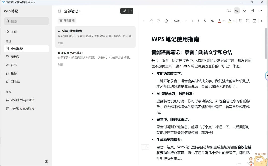 WPS笔记是一款非常好用的AI笔记软件,秉承“随心记录,永远有序”的理念,融合了AI Agent技术,它不仅保留了传统便签的便捷性,更融入了现代化的功能设计。最新版本支持图文混排功能,让您的笔记更加生动丰富。无论是日常灵感捕捉、工作备忘,还是生活日记,都能轻松胜任。其流畅的操作体验和人性化的设计细节,让记录变得更加高效愉悦。WPS笔记专注于将用户的的零散信息自动分类、打标签、建立关联并提炼要点,WPS便签重新定义了数字笔记的体验,堪称当前最优秀的便签应用之一。