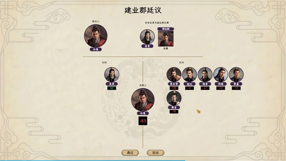 8、为了呈现复杂、真实的政治决策过程,游戏设计了廷议系统,官员任命、宣战、和平等重大事务都需经过廷议,声望高的属下可以极大的影响主公的决策。