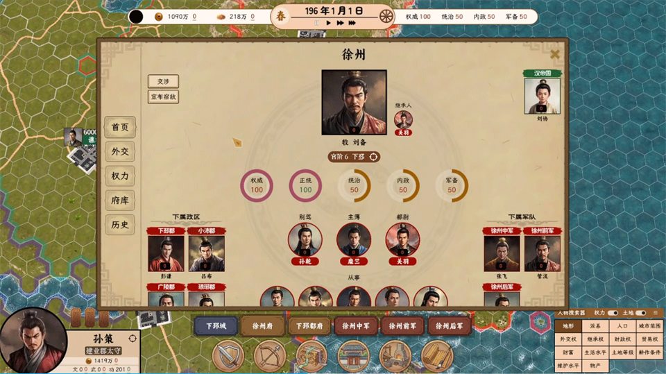 7、游戏设计了从郡、州、都督区到帝国的四级政区,政区的权力范围是高度定制化的,不同的权力组合可造就变化多端的政区形态。