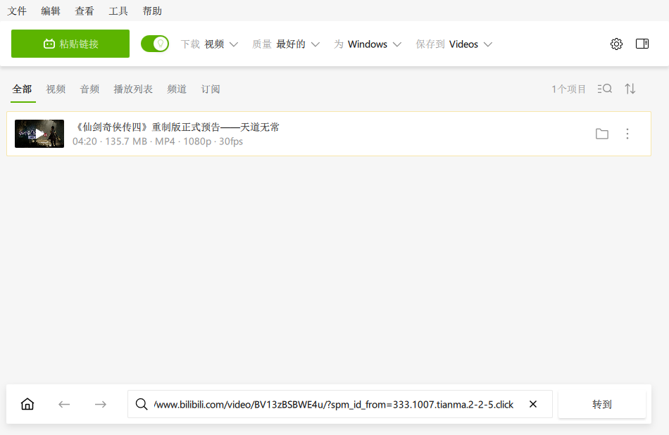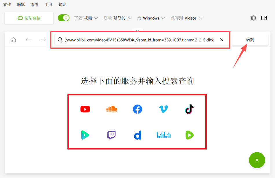 3、返回软件,将复制的网址粘贴其中,随后点击“转到”,当然,也可以通过屏幕下方选项直接进入相关网站寻找视频。